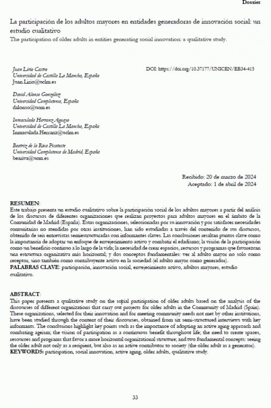 La participación de los adultos mayores en entidades generadoras de innovación social: un estudio cualitativo / Juan Lirio Castro [et al] [Recurs electrònic]