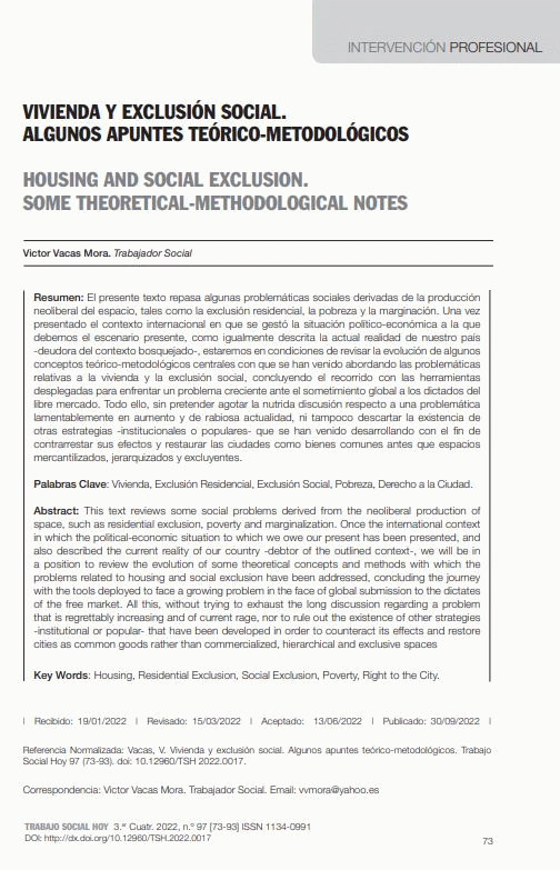 Vivienda y exclusión social. Algunos apuntes teórico-metodológicos / Victor Vacas Mora [Recurs electrònic]