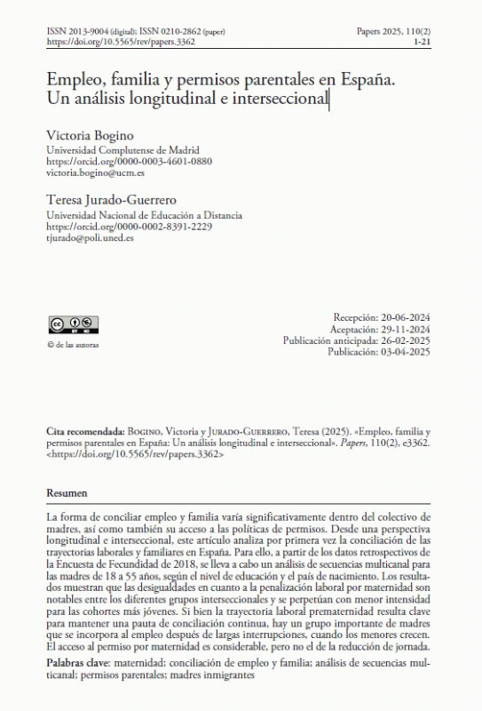 "La manera de conciliar ocupació i família varia significativament dins del col·lectiu de mares, així com també el seu accés a les polítiques de permisos. Des d'una perspectiva longitudinal i interseccional, aquest article analitza per primera vegada la conciliació de les trajectòries laborals i familiars a Espanya. Per a això, a partir de les dades retrospectives de l'Enquesta de Fecunditat de 2018, es duu a terme una anàlisi de seqüències multicanal per a les mares de 18 a 55 anys, segons el nivell d'educació i el país de naixement. Els resultats mostren que les desigualtats quant a la penalització laboral per maternitat són notables entre els diferents grups interseccionals i es perpetuen amb menor intensitat per a les cohorts més joves. Si bé la trajectòria laboral prematernitat resulta clau per a mantenir una pauta de conciliació contínua, hi ha un grup important de mares que s'incorpora a l'ocupació després de llargues interrupcions, quan els menors creixen. L'accés al permís per maternitat és considerable, però no el de la reducció de jornada."