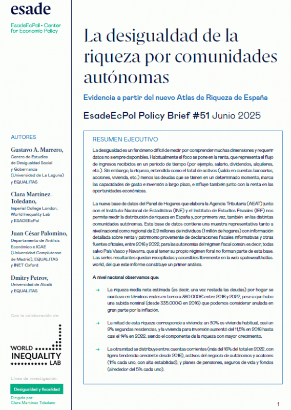 "La desigualtat és un fenomen difícil de mesurar per comprendre moltes dimensions i requerir dades no sempre disponibles. Habitualment el focus es posa en la renda, que representa el flux d'ingressos rebuts en un període de temps (per exemple, salari, dividends, lloguers, etc.). No obstant això, la riquesa, entesa com el total d'actius (saldo en comptes bancaris, accions, habitatge, etc.) menys els deutes que es tenen en un determinat moment, marca les capacitats de despesa i inversió a llarg termini, i influeix també juntament amb la renda en les oportunitats econòmiques. La nova base de dades del Panell de Llars que elabora l'Agència Tributària juntament amb l'Institut Nacional d'Estadística i l'Institut d'Estudis Fiscals ens permet mesurar la distribució de riquesa a Espanya i, per primera vegada, també en les diferents comunitats autònomes. Aquesta base de dades conté una mostra representativa tant a nivell nacional com regional de 2,9 milions d'individus (1 milió de llars) amb informació detallada sobre renda i patrimoni provinent de declaracions fiscals informatives i altres fonts oficials, entre 2016 i 2022, per a les autonomies del règim fiscal comú: és a dir, totes excepte País Basc i Navarra, que en tenir el seu propi règim foral no formen part d'aquesta base. Les sèries resultants queden recopilades i accessibles lliurement en la web spainwealthatlas. world, del qual aquest informe constitueix una primera anàlisi."