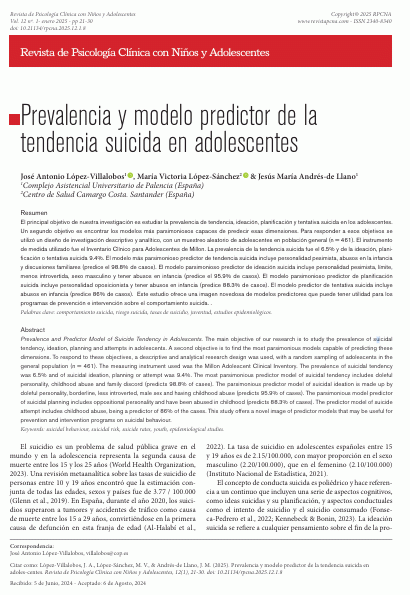 "El principal objectiu de la nostra recerca és estudiar la prevalença de tendència, ideació, planificació i temptativa suïcida en els adolescents. Un segon objectiu és trobar els models més parsimoniosos capaços de predir aquestes dimensions. Per a respondre a aquests objectius es va utilitzar un disseny de recerca descriptiu i analític, amb un mostreig aleatori d'adolescents en població general (n = 461). L'instrument de mesura utilitzat va ser l'Inventari Clínic per a Adolescents de Millon. La prevalença de la tendència suïcida va ser el 6.5% i de la ideació, planificació o temptativa suïcida 9.4%. El model més parsimoniós predictor de tendència suïcida inclou personalitat pessimista, abusos en la infància i discussions familiars (prediu el 98.8% de casos). El model parsimoniós predictor d'ideació suïcida inclou personalitat pessimista, límit, menys introvertida, sexe masculí i tenir abusos en infància (prediu el 95.9% de casos). El model parsimoniós predictor de planificació suïcida inclou personalitat oposicionista i tenir abusos en infància (prediu 88.3% de casos). El model predictor de temptativa suïcida inclou abusos en infància (prediu 86% de casos). Aquest estudi ofereix una imatge nova de models predictors que pot tenir utilitat per als programes de prevenció i intervenció sobre el comportament suïcida. ."
