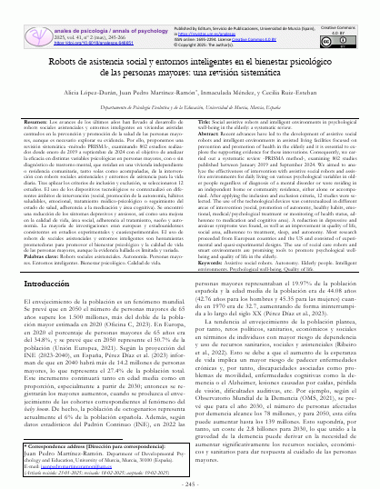 Robots de asistencia social y entornos inteligentes en el bienestar psicológico de las personas mayores: una revisión sistemática una revisión sistemática / Alicia López-Durán, Juan Pedro Martínez-Ramón, Inmaculada Méndez, y Cecilia Ruiz-Esteban [Recurs electrònic]