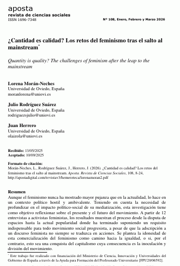 En: Aposta: Revista de ciencias sociales, ISSN-e 1696-7348, Nº. 108, 2026, págs. 8-24Resumen: "Encara que el feminisme mai ha mostrat major puixança que en l'actualitat, el fa en un context polític hostil i ambivalent. Tenint en compte la necessitat d'aprofundir en l'impacte polític-social de la seva mediatització, aquesta recerca té com a objectiu reflexionar sobre el present i el futur del moviment. A partir de 12 entrevistes a activistes feministes, els resultats mostren el procés des de la disputa d'espais fins a l'actual popularitat on ha acabat suposant un requisit indispensable per a tot moviment social progressista, a pesar que l'adscripció a un discurs feminista no sempre es tradueixi en accions. Es planteja la idoneïtat d'aquesta comercialització del feminisme com a camí cap a la igualtat, o si, per contra, això sigui una conquesta del capitalisme la conseqüència del qual és la inoculació i divisió del moviment."